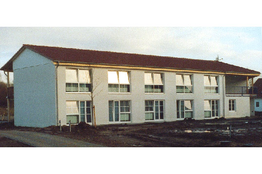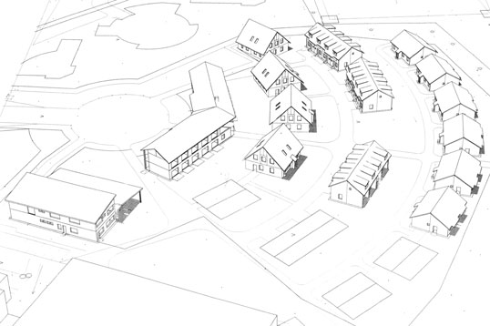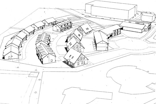 Neubau von 15 ein- und zweigeschossigen Einzel-, Doppel-, und Reihenhäusern mit insgesamt 32 WE in Holzfertigteil- und Stahlbetonbauweise, 1 Apartmenthaus mit 20 WE sowie einem Gemeinschaftshaus inkl. Grundstückserschließung.